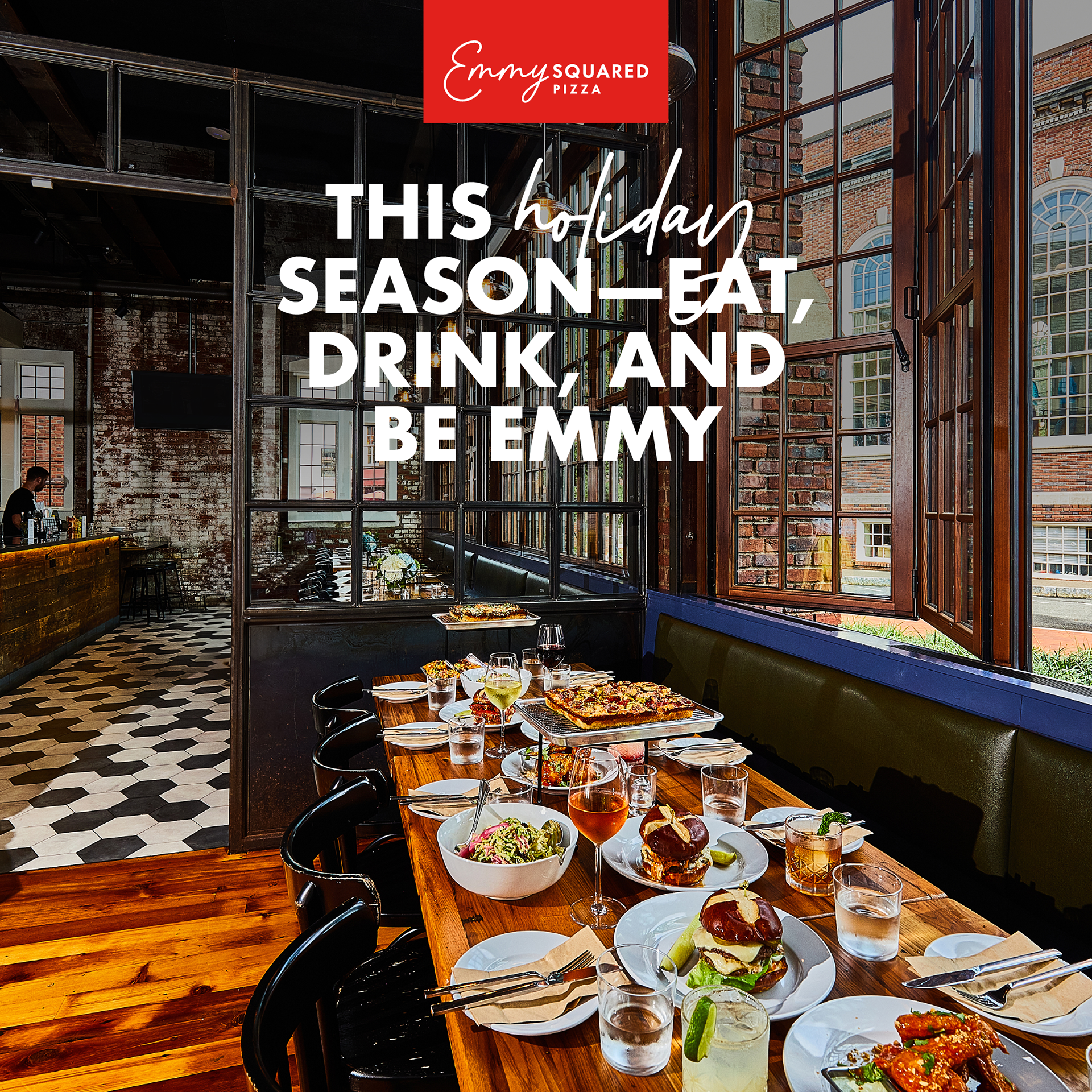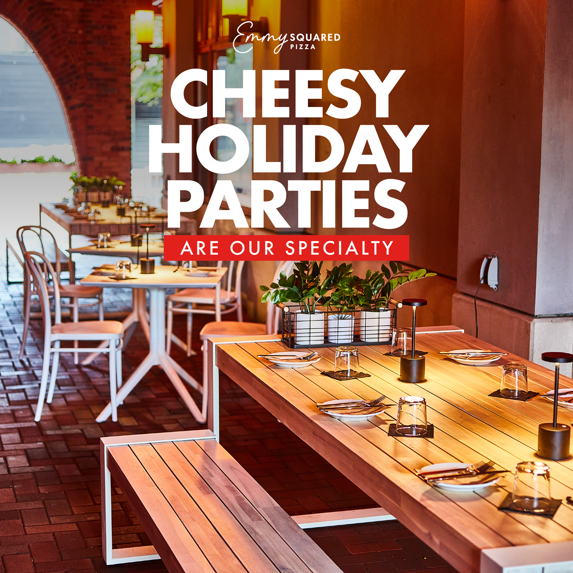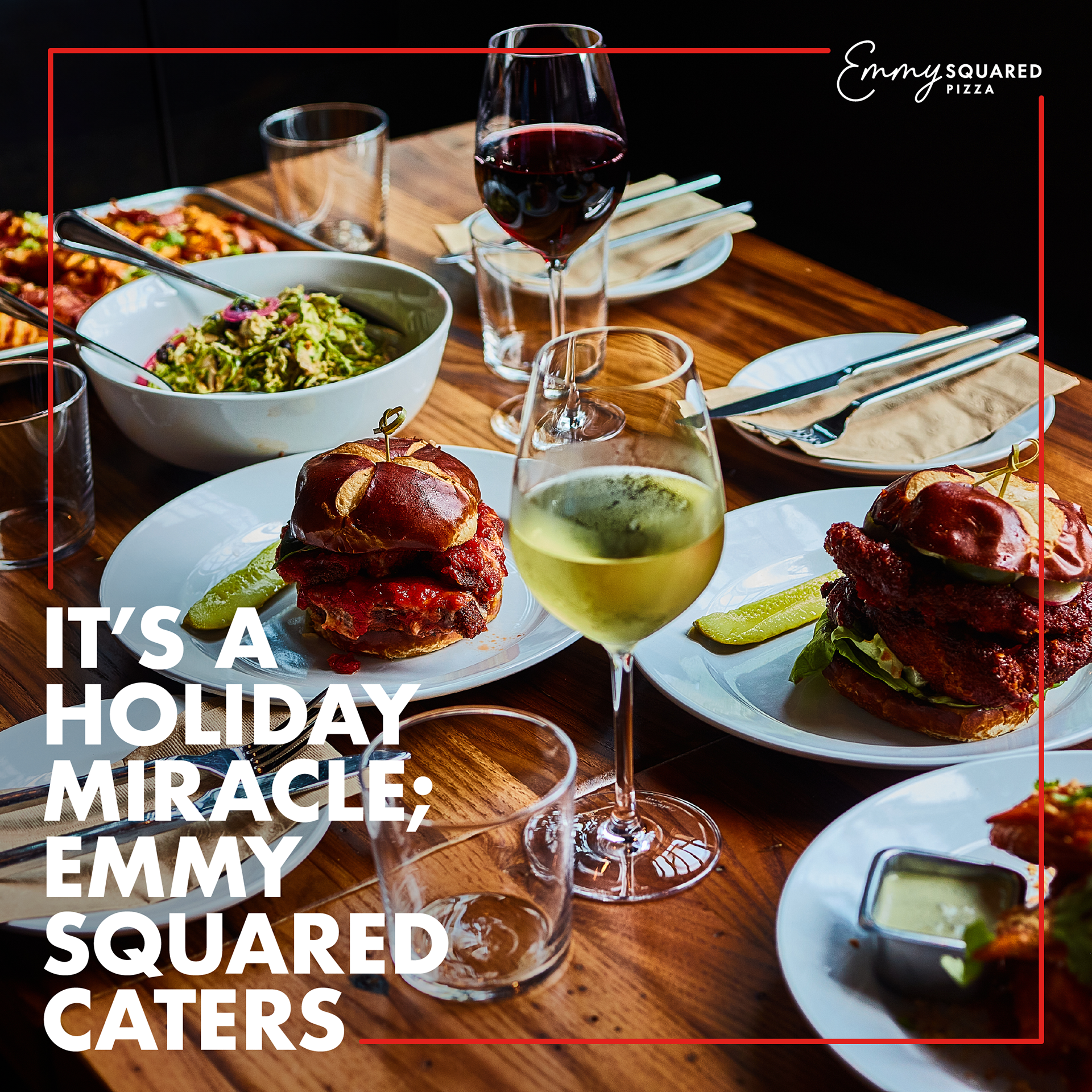 Emmy Squared Copy for seasonal ads pinned on Emmy Squared Pizza's Instagram grid to increase holiday catering sales.