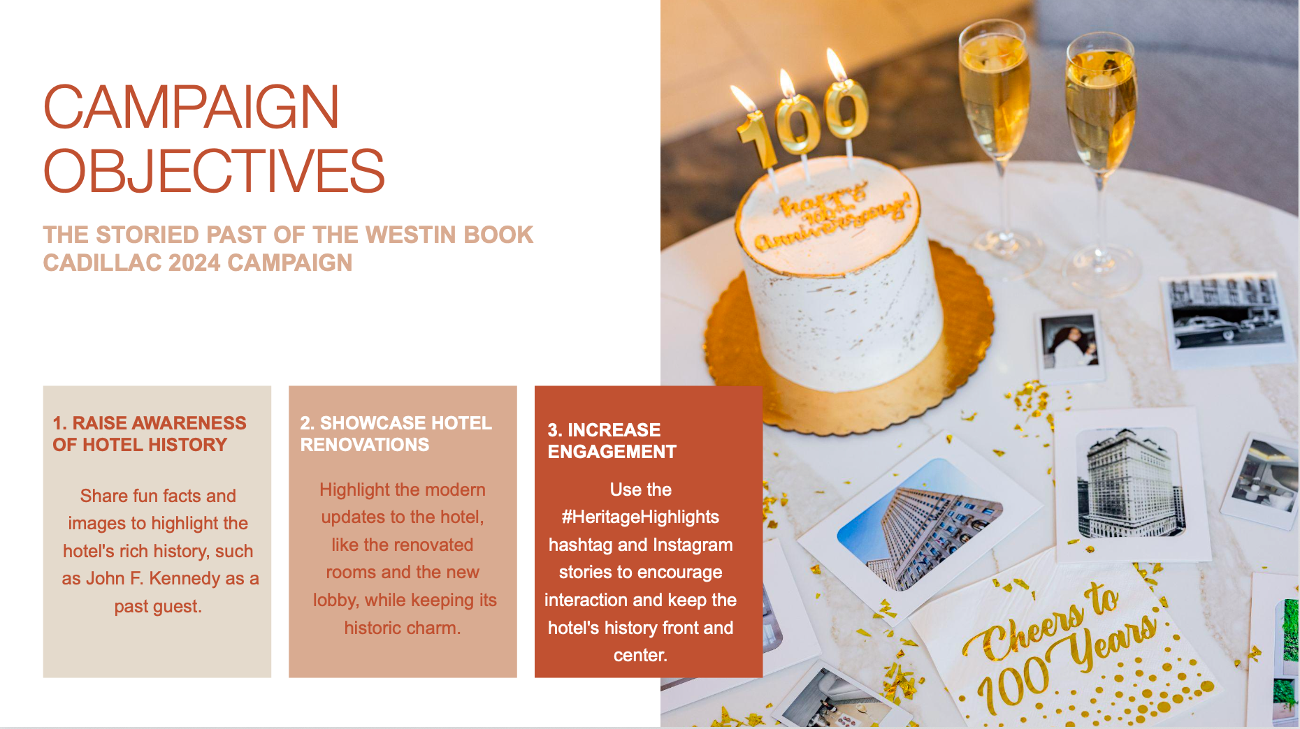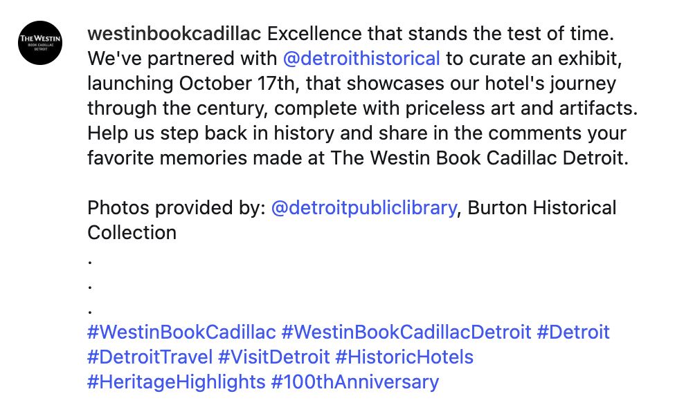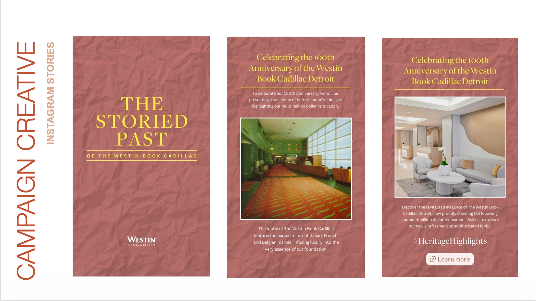Copy and creative from The Storied Past of Westin Book Cadillac's digital awareness campaign, positioned as a celebration for its centennial anniversary.